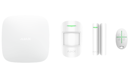 Startsættet til Ajax sikkerhedssystemet består af en Hub, bevægelsesdetektor, Dør-/vinduesdetektor samt en nøglering med panik-knap.