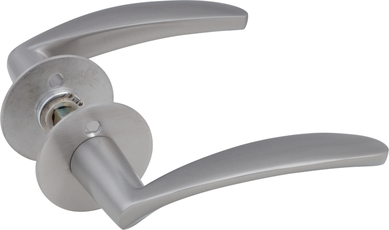Massiv luksus dørgreb i rustfrit stål. med fastsiddende roset og gennemgående skruer.