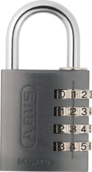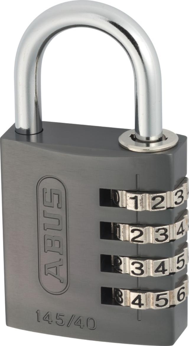 ABUS 145 hængelåsen består af et massivt låsehus af aluminium og en bøjle af stål. Den er velegnet til lukning af tasker, kufferter, chatoller, kasser, skabe og meget mere. Vi anbefaler varianterne 145/20 til 145/30, hvis du ønsker at sikre mindre værdigenstande eller genstande med lav risiko for tyveri. Den store variant 145/40 er velegnet til sikring af mellemstore værdigenstande eller genstande med en gennemsnitlig risiko for tyveri. Talkoden kan indstilles individuelt med tre eller fire talhjul, afhængigt af låsens størrelse. Takket være deres lette vægt, er vores kombinationslåse 145 nemme at bruge når som helst, selv når du er på farten.