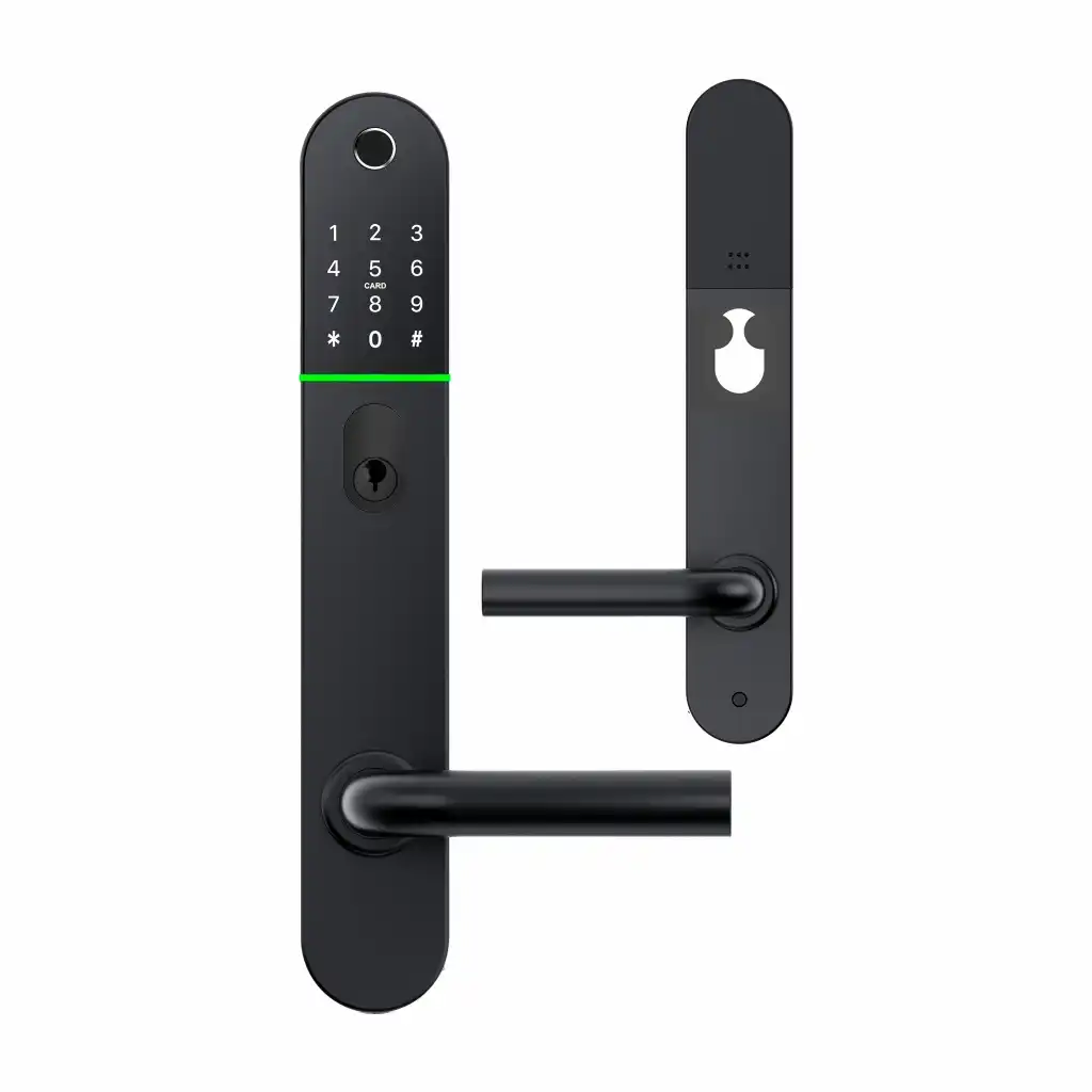 Elektronisk dørlås til dobbeltcylinder (rokoko). Kan åbnes med kode, nøglebrik, fingeraftryk, fjernbetjening og via en app til iOS og Android. Passer til døre med trepunktslås. Inkl. 2 stk. nødåbningsnøgler, 2 stk. nøglebrikker og skruer.