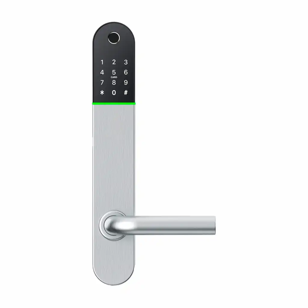 Elektronisk dørlås, der kan åbnes med kode, nøglebrik, fingeraftryk, fjernbetjening og mobilapp (iOS og Android). Passer til døre med trepunktslås. Bredden på denne model er 49 mm. Med appen er det muligt at give nem adgang til gæster, håndværkere eller lignende med tidsbestemte koder, fjernåbning eller tidsskemaer for låsning.