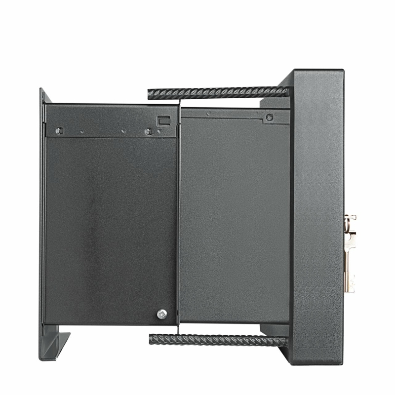 Vægskabets dør er dobbeltvægget og udstyret med yderligere beskyttende forstærkninger . Dørpanelet er udført i massivt SM stål, 7 mm tykt . Døren er låst på tre sider og med robuste firkantbolte . Låseboltene i top og bund har en integreret stålrulle. Dette betyder ekstrem ekstra beskyttelse mod åbning ved flammeskæring, boring og penetrering . En kontinuerlig bageste grebskinne på hængselsiden øger modstanden mod forsøg på indbrud. Din sikkerhed plus med 614- og 616-serien: Et termisk nødlåsesystem øger også sikkerheden.